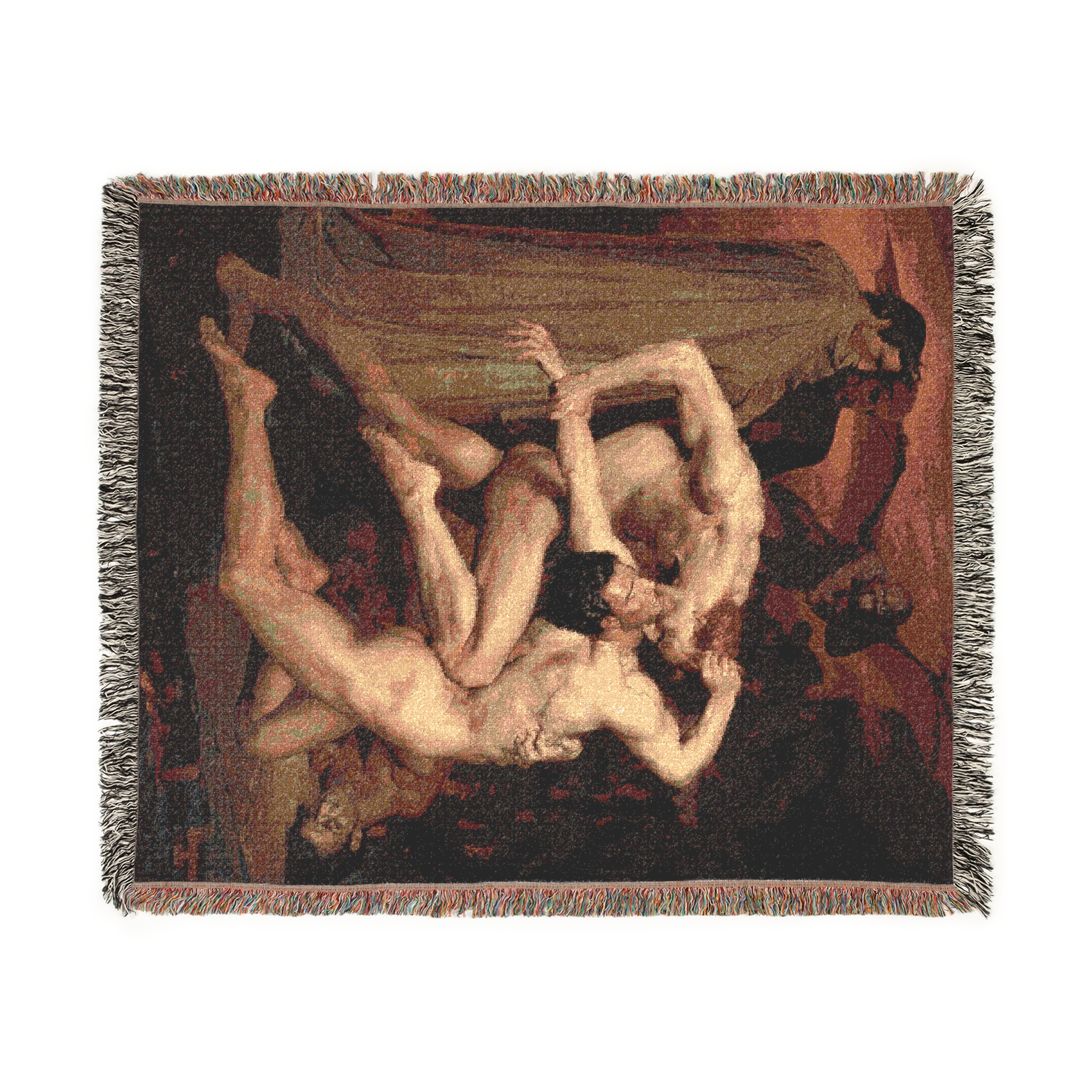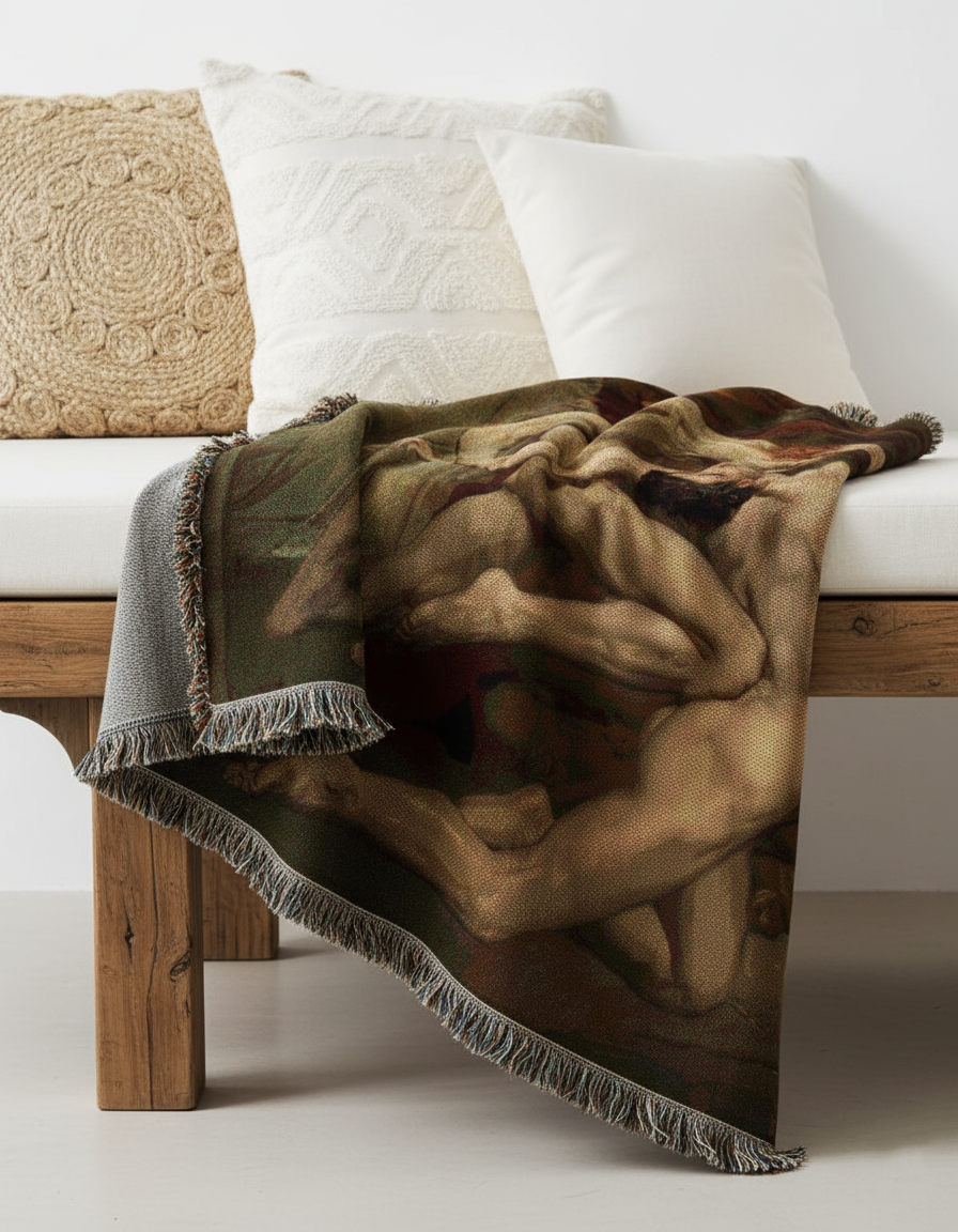At The Noha Studio, this masterpiece has been reimagined into a woven blanket, transforming a moment of mythic torment into a striking textile statement. Draped over a sofa or worn across the shoulders, it carries with it the intensity of classical art—an object that merges storytelling, history, and contemporary living. The blanket becomes not just a textile, but a stage where epic poetry and fine art find new warmth in daily life.