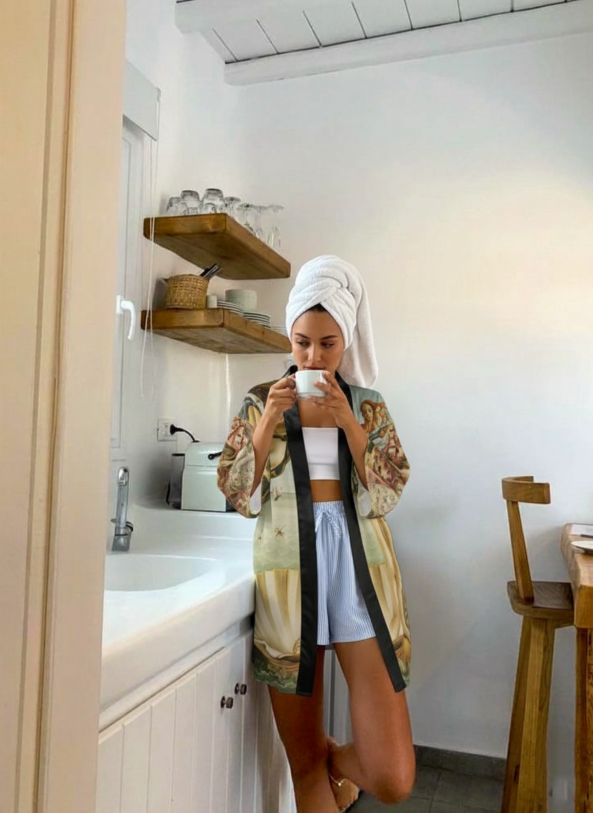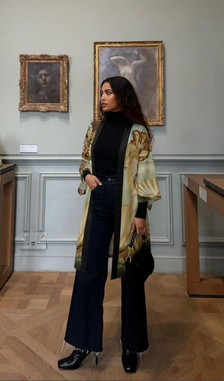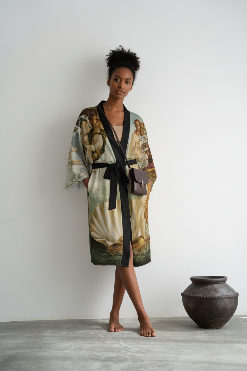 Experience the ethereal beauty of Botticelli’s The Birth of Venus with this long sleeve kimono robe from The Noha Studio. Flowing grace, delicate waves, and soft hues create a sense of rebirth and serenity, turning this kimono into a living canvas. Perfect for those who appreciate wearable art and poetic elegance, this kimono is ideal for special occasions, celebrations, and holidays.