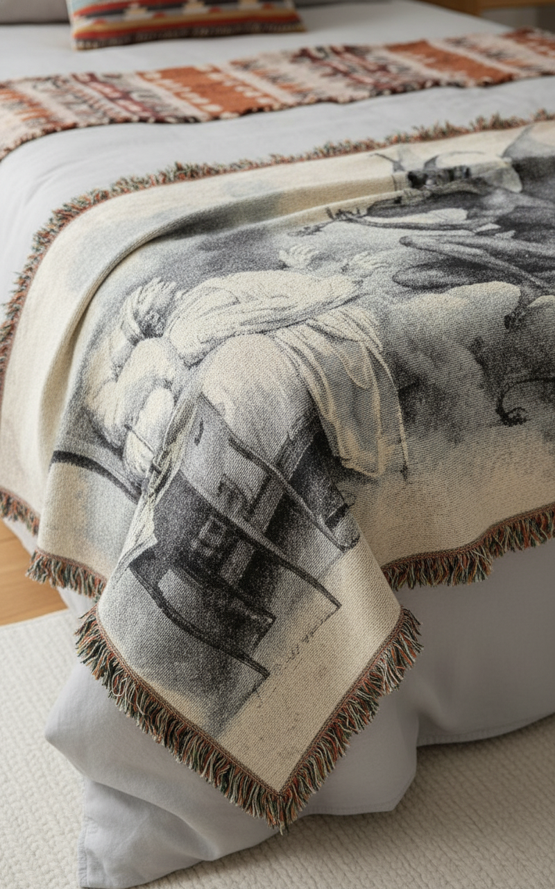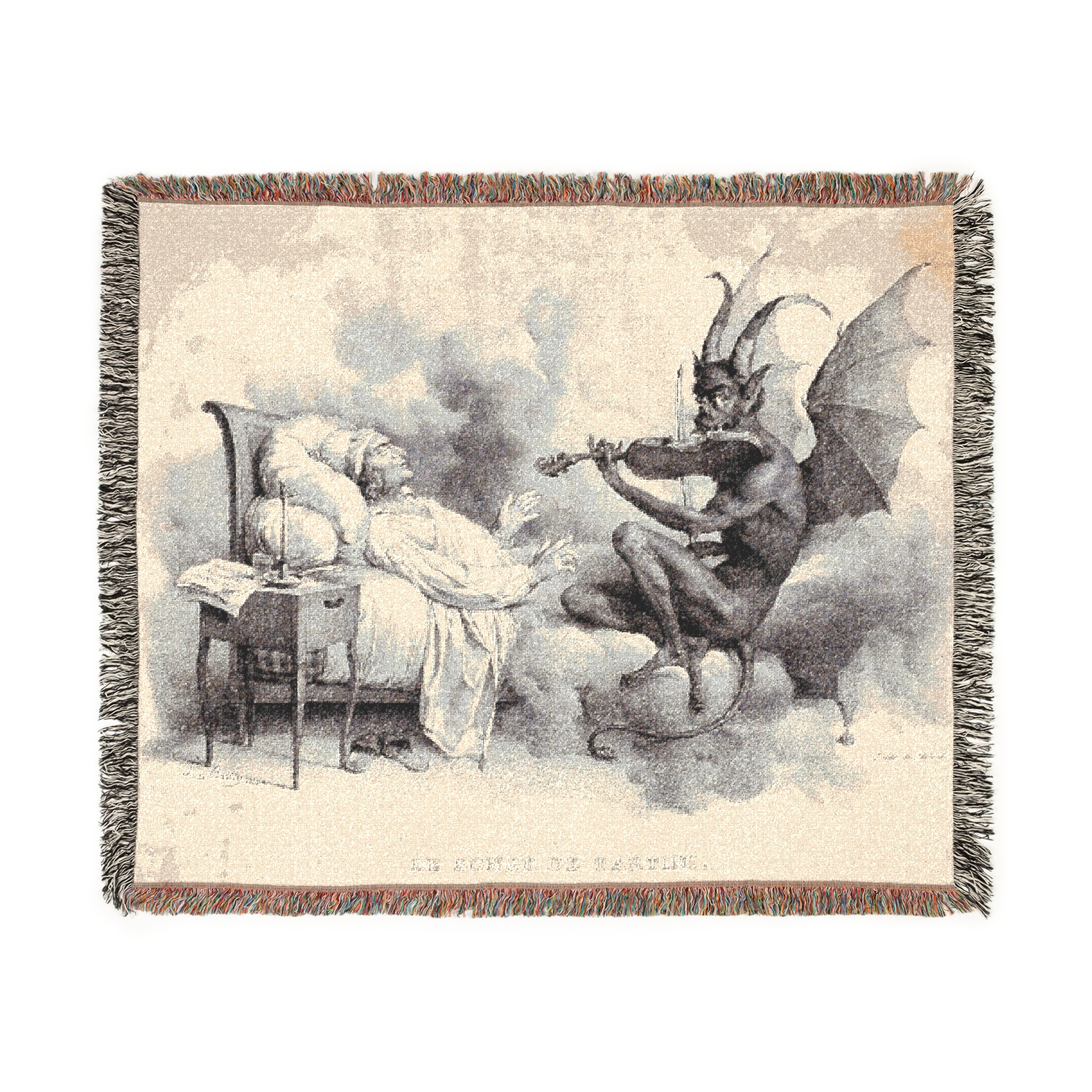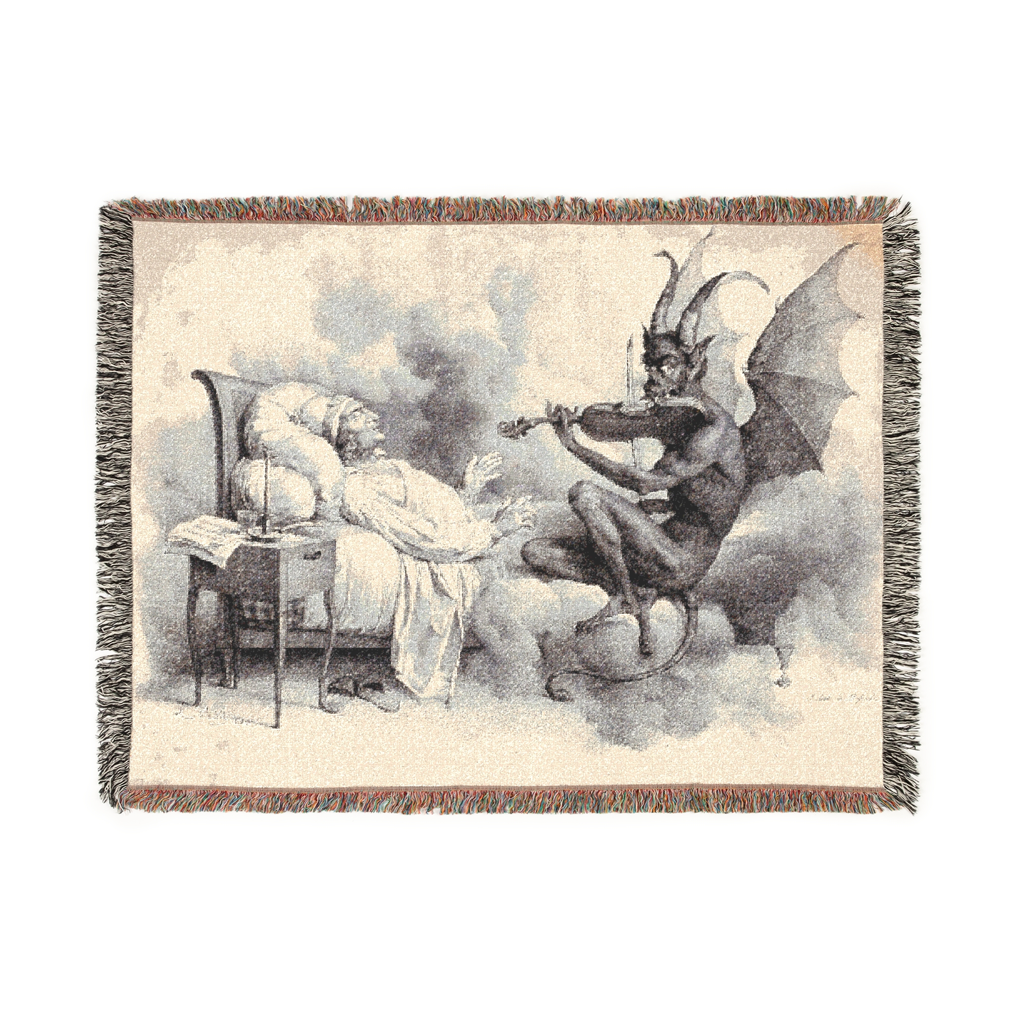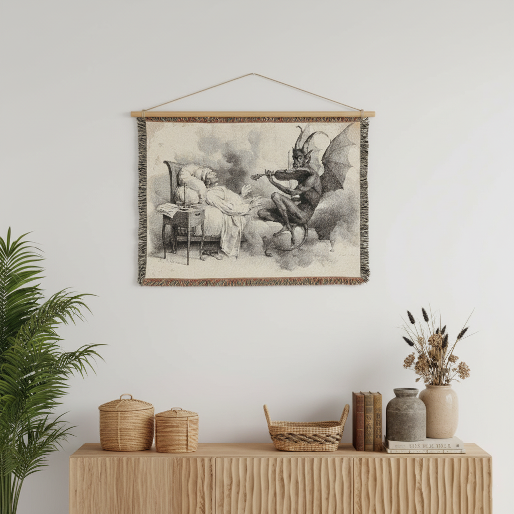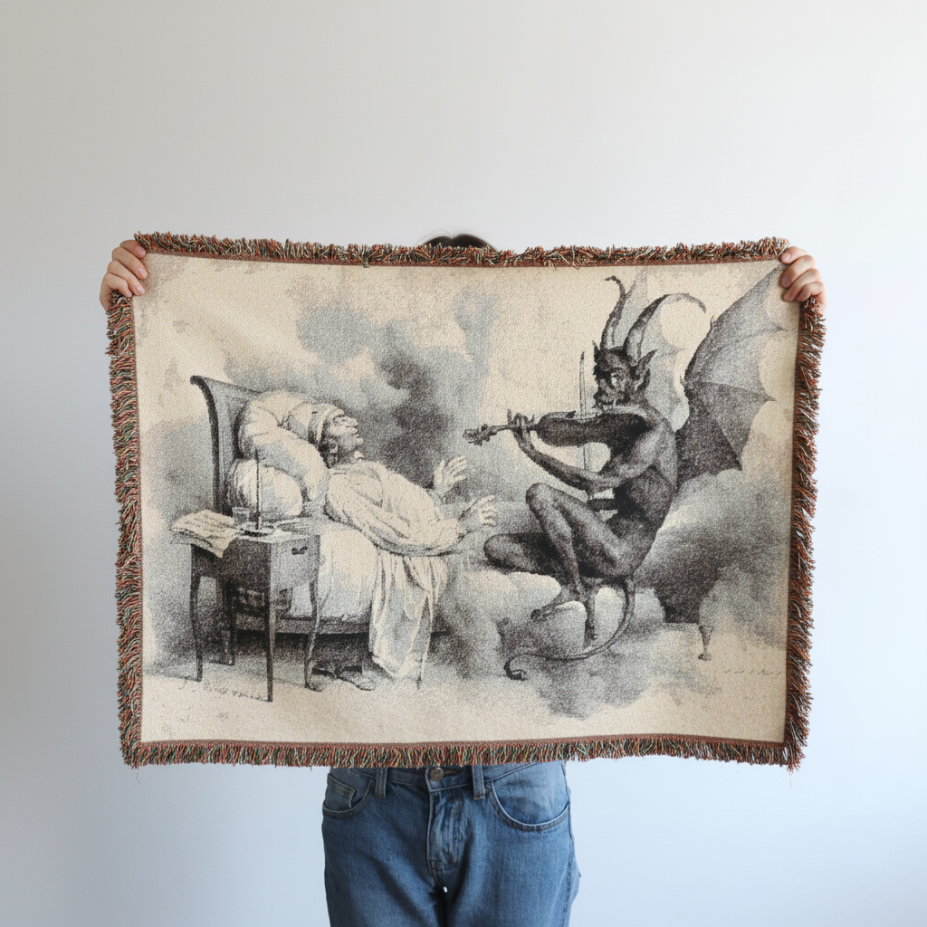 Tartini’s Dream Woven Blanket is a haunting and eerie piece inspired by a 19th-century illustration, capturing the legend of composer Giuseppe Tartini and the Devil playing a sonata. It is a tactile, everyday object that blurs the lines between art, dream, and the supernatural, perfect for enveloping both body and mind. Relevant for fans of Tartini’s music, folklore enthusiasts, and those intrigued by Romantic tales. Ideal for cozying up during Halloween, music festivals, or simply adding a touch of mystery to daily life.